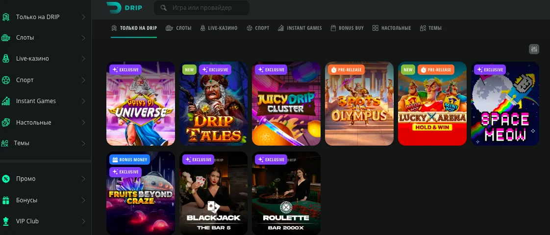 Розділ «Тільки на DRIP» в лобі казино містить унікальну добірку ігор, доступних виключно користувачам цього майданчика. Тут представлені фірмові слоти, такі як Gates of Universe, Drip Tales, Juicy Drip Cluster, Boots of Olympus, Lucky Arena Hold & Win та Space Meow, відмічені плашками NEW, EXCLUSIVE або PRE-RELEASE, що підкреслює їх ексклюзивний статус і ранній доступ саме в цьому казино.