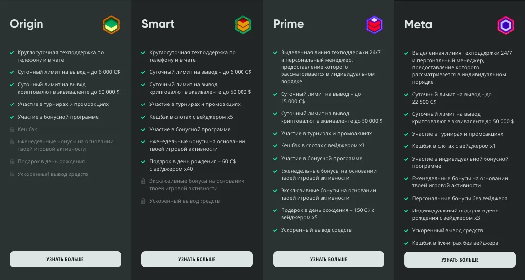 Найвищий рівень Meta надає максимальний пакет привілеїв: виділену лінію техпідтримки 24/7 та персонального менеджера (надання якого розглядається в індивідуальному порядку), суточний ліміт на вивід до 22 500 C$, суточний ліміт на вивід криптовалют в еквіваленті до 50 000 $, участь в турнірах та промоакціях, кешбек в слотах з вейджером x1, участь в індивідуальній бонусній програмі, еженедельні та персональні бонуси без вейджера, індивідуальний подарунок в день народження з вейджером x3, прискорений вивід коштів, а також ексклюзивний кешбек в live-іграх без вейджера.
